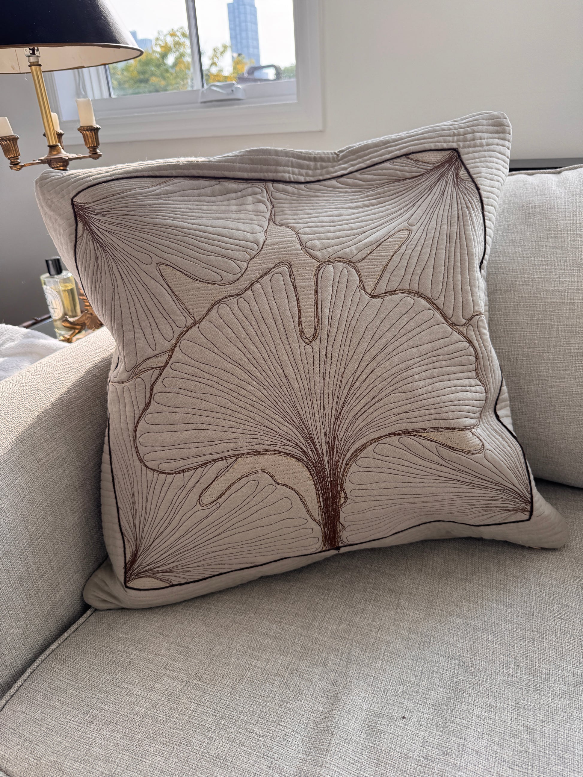 This 15 x 20 inch Gingko Pillow is a stylish and unique addition to any home decor. Made of cotton quilt with cotton batting sorry No pillow included, this decorative pillow features a beautifully stitched gingko pattern. Perfect for adding a touch of elegance to any room.